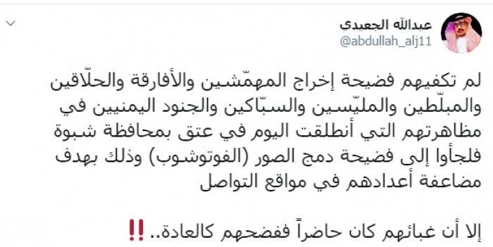 وكتب عبر تغريدة له على "تويتر" رصدها "المشهد العربي": "لم تكفهم فضيحة إخراج المهمّشين والأفارقة والحلّاقين والمبلّطين والمليّسين والسبّاكين والجنود اليمنيين في مظاهرتهم التي انطلقت اليوم في عتق بمحافظة شبوة فلجأوا إلى فضيحة دمج الصور (الفوتوشوب) وذلك بهدف مضاعفة أعدادهم في مواقع التواصل، إلا أن غباءهم كان حاضرا ففضحهم كالعادة".