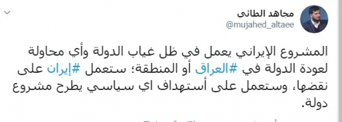 وكتب عبر تغريدة له على "تويتر" رصدها " المشهد العربي": "المشروع الإيراني يعمل في ظل غياب الدولة وأي محاولة لعودة الدولة في العراق أو المنطقة؛ ستعمل إيران على نقضها، وستعمل على استهداف اي سياسي يطرح مشروع دولة".