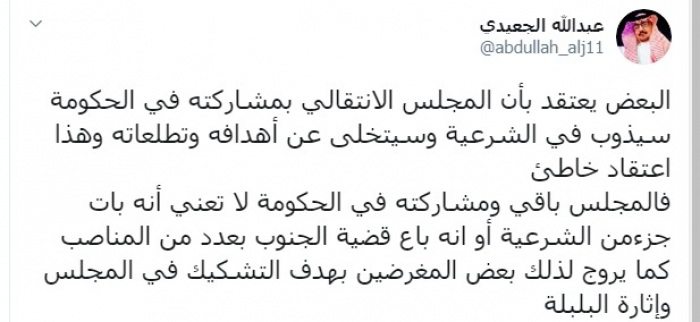 وكتب عبر تغريدة له على "تويتر" رصدها "المشهد العربي": "البعض يعتقد بأن المجلس الانتقالي بمشاركته في الحكومة سيذوب في الشرعية وسيتخلى عن أهدافه وتطلعاته وهذا اعتقاد خاطئ، فالمجلس باق ومشاركته في الحكومة لا تعني أنه بات جزءا من الشرعية أو أنه باع قضية الجنوب بعدد من المناصب كما يروج لذلك بعض المغرضين بهدف التشكيك في المجلس وإثارة البلبلة".