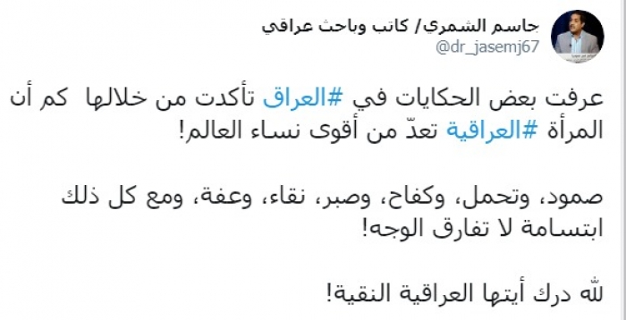 وكتب عبر تغريدة له على "تويتر" رصدها " المشهد العربي": "عرفت بعض الحكايات في العراق تأكدت من خلالها كم أن المرأة العراقية تعدّ من أقوى نساء العالم، صمود، وتحمل، وكفاح، وصبر، نقاء، وعفة، ومع كل ذلك ابتسامة لا تفارق الوجه، لله درك أيتها العراقية النقية".
