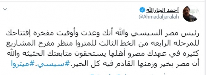 وكتب عبر تغريدة له على "تويتر" رصدها " المشهد العربي": "رئيس مصر السيسي، والله أنك وعدت وأوفيت، مفخرة افتتاحك للمرحلة الرابعة من الخط الثالث للمترو، منظر مفرح، المشاريع كثيرة في عهدك، مصرو أهلها يستحقون متابعتك الحثيثة، والله أن مصر بخير وزمنها القادم فيه كل الخير".