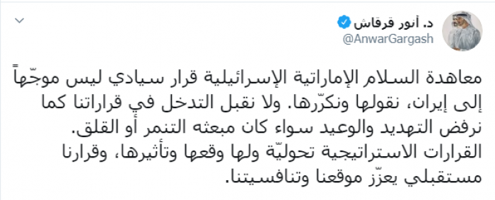 وكتب عبر تغريدة له على "تويتر" رصدها " المشهد العربي": "معاهدة السلام الإماراتية الإسرائيلية قرار سيادي ليس موجّهاً إلى إيران، نقولها ونكرّرها، ولا نقبل التدخل في قراراتنا كما نرفض التهديد والوعيد سواء كان مبعثه التنمر أو القلق".