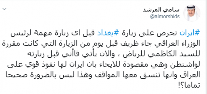 وكتب عبر تغريدة له على "تويتر" رصدها " المشهد العربي":"إيران تحرص على زيارة بغداد قبل أي زيارة مهمة لرئيس الوزراء العراقي، جاء ظريف قبل يوم من الزيارة التي كانت مقررة للسيد الكاظمي للرياض ، والآن يأتي قاآني قبل زيارته لواشنطن وهي مقصودة للإيحاء بأن إيران لها نفوذ قوي على العراق وأنها تنسق معها المواقف وهذا ليس بالضرورة صحيح تماما".