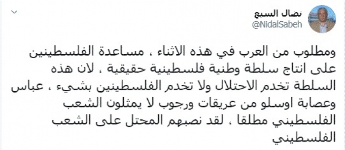 وكتب في تغريدة عبر "تويتر" رصدها "المشهد العربي": "ومطلوب من العرب في هذه الأثناء، مساعدة الفلسطينين على إنتاج سلطة وطنية فلسطينية حقيقية، لأن هذه السلطة تخدم الاحتلال ولا تخدم الفلسطينيين بشيء".