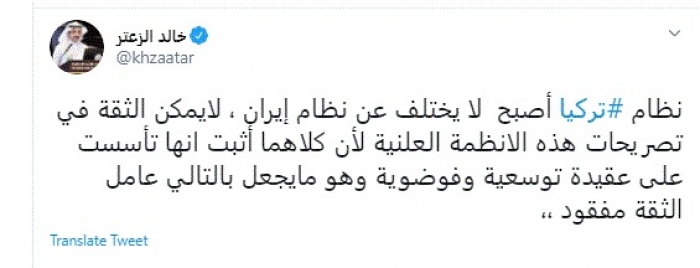 وقال في تغريدة عبر "تويتر" رصدها "المشهد العربي": "نظام تركيا أصبح لا يختلف عن نظام إيران، لا يمكن الثقة في تصريحات هذه الأنظمة العلنية لأن كلاهما أثبت أنها تأسست على عقيدة توسعية وفوضوية وهو مايجعل بالتالي عامل الثقة مفقود".