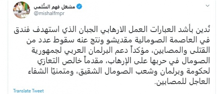 وقال في تغريدة عبر "تويتر" رصدها "المشهد العربي": "ندين بأشد العبارات العمل الإرهابي الجبان الذي استهدف فندق في العاصمة الصومالية مقديشو ونتج عنه سقوط عدد من القتلى والمصابين".