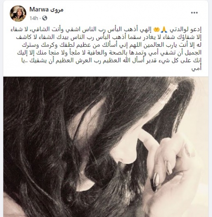 وكتبت: "ادعوا لوالدتي.. إلهي أذهب البأس رب الناس اشفي وأنت الشافي، لا شفاء إلا شفاؤك شفاء لا يغادر سقمًا، أذهب البأس رب الناس بيدك الشفاء لا كاشف له إلا أنت يارب العالمين".