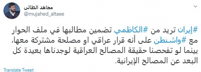 وكتب في تغريدة عبر "تويتر" رصدها "المشهد العربي": "إيران تريد من الكاظمي تضمين مطالبها في ملف الحوار مع واشنطن على أنه قرار عراقي او مصلحة مشتركة معها، بينما لو تفحصنا حقيقة المصالح العراقية لوجدناها بعيدة كل البعد عن المصالح الإيرانية".