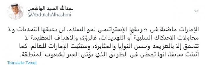 وكتب في تغريدة عبر "تويتر" رصدها "المشهد العربي": "الإمارات ماضية في طريقها الإستراتيجي نحو السلام، لن يعيقها التحديات ولا محاولات الإحتكاك السلبية أو التهديدات، فالرؤى والأهداف العظيمة لا تتحقق إلا بالعزيمة وحسن النوايا والمثابرة".
