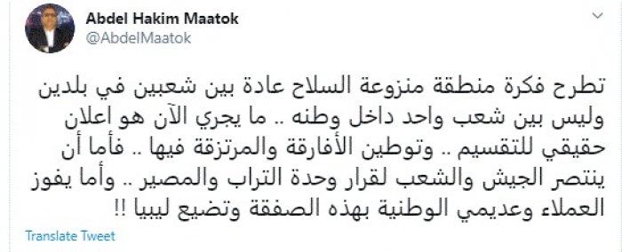 وأضاف: "فأما أن ينتصر الجيش والشعب لقرار وحدة التراب والمصير.. وأما يفوز العملاء وعديمي الوطنية بهذه الصفقة وتضيع ليبيا".