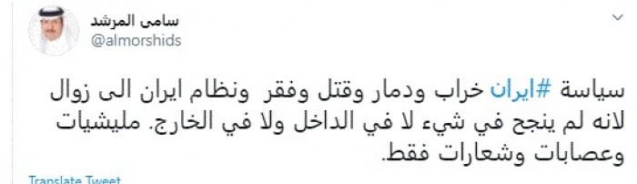 وقال في تغريدة عبر "تويتر" رصدها "المشهد العربي": "سياسة إيران خراب ودمار وقتل وفقر ونظام إيران إلى زوال لأنه لم ينجح في شيء لا في الداخل ولا في الخارج. مليشيات وعصابات وشعارات فقط".