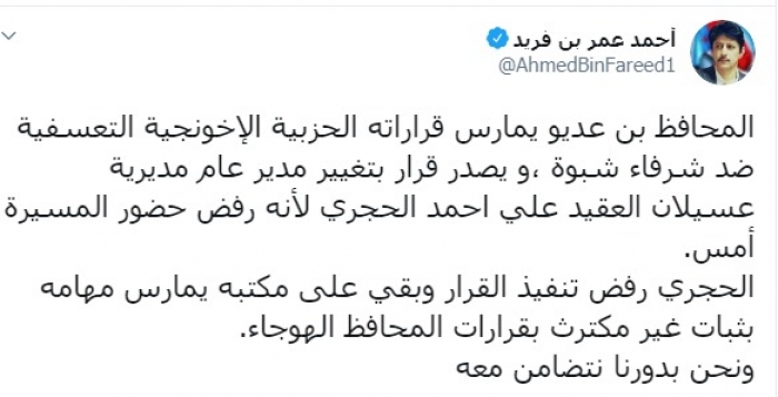 وكتب عبر تغريدة له على "تويتر" رصدها "المشهد العربي": "المحافظ بن عديو يمارس قراراته الحزبية الإخونجية التعسفية ضد شرفاء شبوة، ويصدر قرارا بتغيير مدير عام مديرية عسيلان العقيد علي أحمد الحجري لأنه رفض حضور المسيرة أمس، الحجري رفض تنفيذ القرار وبقي على مكتبه يمارس مهامه بثبات غير مكترث بقرارات المحافظ الهوجاء، ونحن بدورنا نتضامن معه".