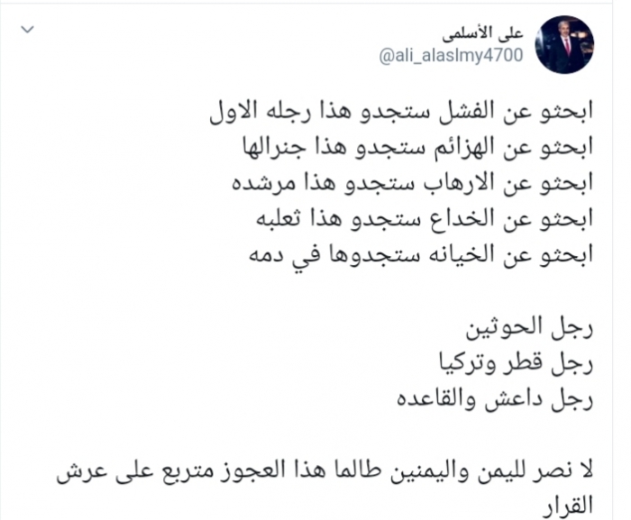 وكتب عبر تغريدة له على "تويتر" رصدها "المشهد العربي": "ابحثوا عن الفشل ستجدوا هذا رجله الأول، ابحثوا عن الهزائم ستجدوا هذا جنرالها، ابحثوا عن الإرهاب ستجدوا هذا مرشده، ابحثوا عن الخداع ستجدوا هذا ثعلبه ابحثوا عن الخيانة ستجدوها في دمه، رجل الحوثيين، رجل قطر وتركيا رجل داعش والقاعدة، لا نصر لليمن واليمنيين طالما هذا العجوز متربع على عرش القرار".
