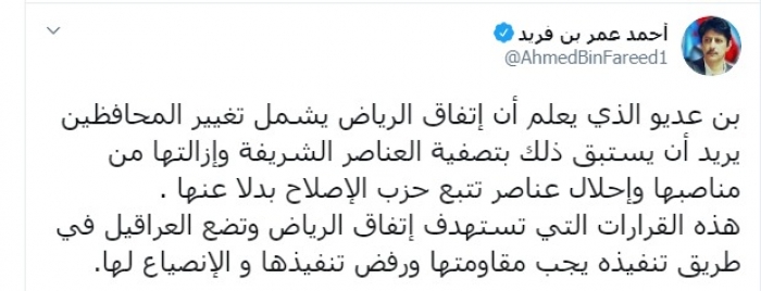 وكتب عبر تغريدة له على "تويتر" رصدها "المشهد العربي": "بن عديو الذي يعلم أن اتفاق الرياض يشمل تغيير المحافظين يريد أن يستبق ذلك بتصفية العناصر الشريفة وإزالتها من مناصبها وإحلال عناصر تتبع حزب الإصلاح بدلا عنها، هذه القرارات التي تستهدف اتفاق الرياض وتضع العراقيل في طريق تنفيذه يجب مقاومتها ورفض تنفيذها والانصياع لها".