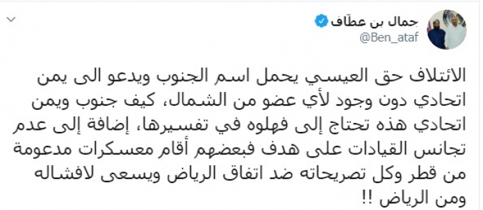 وكتب عبر تغريدة له على "تويتر" رصدها "المشهد العربي": "الائتلاف حق العيسي يحمل اسم الجنوب ويدعو إلى يمن اتحادي دون وجود لأي عضو من الشمال، كيف جنوب ويمن اتحادي هذه تحتاج إلى فهلوة في تفسيرها، إضافة إلى عدم تجانس القيادات على هدف فبعضهم أقام معسكرات مدعومة من قطر وكل تصريحاته ضد اتفاق الرياض ويسعى لإفشاله ومن الرياض".