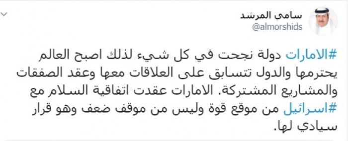 وكتب عبر تغريدة له على "تويتر" رصدها " المشهد العربي": "الإمارات دولة نجحت في كل شيء لذلك أصبح العالم يحترمها والدول تتسابق على العلاقات معها وعقد الصفقات والمشاريع المشتركة".