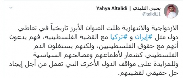 وكتب عبر تغريدة له على "تويتر" رصدها " المشهد العربي": "الازدواجية والانتهازية ظلت العنوان الأبرز تاريخياً في تعاطي دول مثل إيران و تركيا مع القضية الفلسطينية، فهم يدعون أنهم مع حقوق الفلسطينيين، ولكنهم يستغلون الدم الفلسطيني كشعار لأطماعهم ومصالحهم السياسية وللمزايدة على مواقف الدول الأخرى التي تعمل من أجل إيجاد حل حقيقي لقضيتهم".