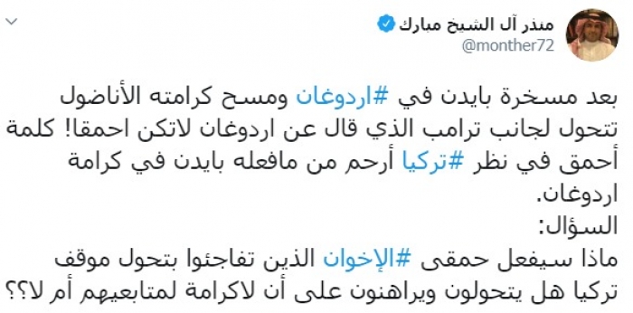 وكتب عبر تغريدة له على "تويتر" رصدها " المشهد العربي": "بعد مسخرة بايدن في أردوغان ومسح كرامته، الأناضول تتحول لجانب ترامب الذي قال عن أردوغان لاتكن أحمقا، كلمة أحمق في نظر تركيا أرحم من مافعله بايدن في كرامة اردوغان".