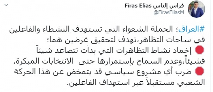 وكتب عبر تغريدة له على "تويتر" رصدها " المشهد العربي": "العراق؛ الحملة الشعواء التي تستهدف النشطاء والفاعلين في ساحات التظاهر، تهدف لتحقيق غرضين هما؛ إخماد نشاط التظاهرات التي بدأت تتصاعد شيئاً فشيئاً، وعدم السماح باستمرارها حتى الانتخابات المبكرة".