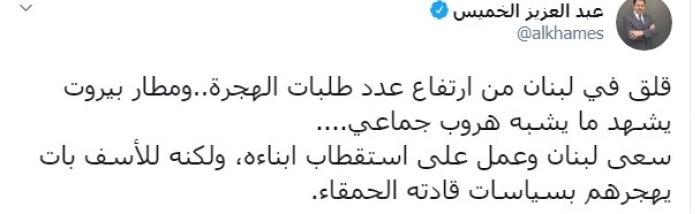 وكتب عبر تغريدة له على "تويتر" رصدها " المشهد العربي": "قلق في لبنان من ارتفاع عدد طلبات الهجرة، ومطار بيروت يشهد ما يشبه هروب جماعي، سعى لبنان وعمل على استقطاب أبناءه، ولكنه للأسف بات يهجرهم بسياسات قادته الحمقاء".