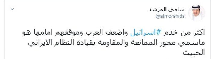 وكتب عبر تغريدة له على "تويتر" رصدها " المشهد العربي": "أكثر من خدم إسرائيل وأضعف العرب وموقفهم أمامها هو ماسمي محور الممانعة والمقاومة بقيادة النظام الإيراني الخبيث".