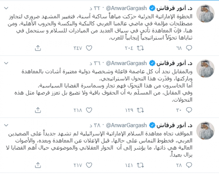 وكتب عبر تغريدة له على "تويتر" رصدها " المشهد العربي": "المواقف تجاه معاهدة السلام الإماراتية الإسرائيلية لم تشهد جديداً على الصعيدين العربي، فخطوط التماس على حالها، قبل الإعلان عن المعاهدة وبعده، والأصوات العالية هي ذاتها، ما يؤشر إلى أن الحوار العقلاني والموضوعي حيال أهم القضايا لا يزال بعيداً".
