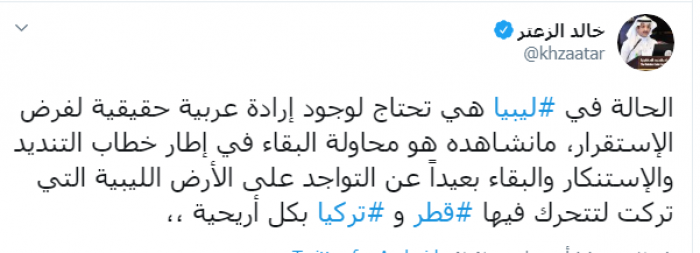 وكتب عبر تغريدة له على "تويتر" رصدها " المشهد العربي": "الحالة في ليبيا هي تحتاج لوجود إرادة عربية حقيقية لفرض الاستقرار، ما نشاهده هو محاولة البقاء في إطار خطاب التنديد والاستنكار والبقاء بعيداً عن التواجد على الأرض الليبية التي تركت لتتحرك فيها قطر وتركيا بكل أريحية".