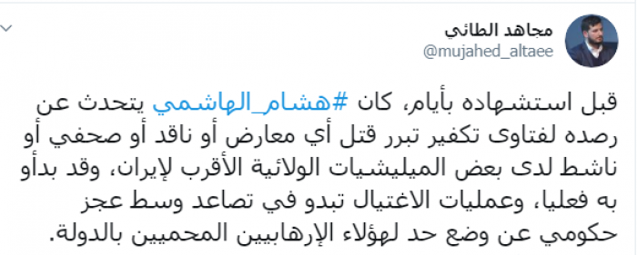 وكتب عبر تغريدة له على "تويتر" رصدها " المشهد العربي": "قبل استشهاده بأيام، كان هشام الهاشمي يتحدث عن رصده لفتاوى تكفير تبرر قتل أي معارض أو ناقد أو صحفي أو ناشط لدى بعض الميليشيات الولائية الأقرب لإيران، وقد بدأوا به فعليا، وعمليات الاغتيال تبدو في تصاعد وسط عجز حكومي عن وضع حد لهؤلاء الإرهابيين المحميين بالدولة".