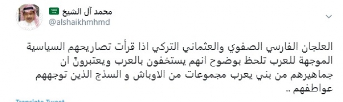 وقال في تغريدة عبر "تويتر" رصدها "المشهد العربي": "..... الفارسي الصفوي والعثماني التركي إذا قرأت تصاريحهم السياسية الموجهة للعرب تلحظ بوضوح أنهم يستخفون بالعرب ويعتبرونً أن جماهيرهم من بني يعرب مجموعات من ...... والسذج الذين توجههم عواطفهم".