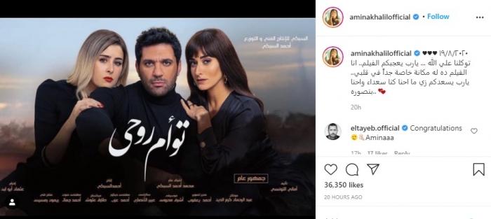 عبرت الفنانة أمينة خليل عن سعادتها بمشاركتها في فيلم "توأم روحي"، الذي يعرض 19 أغسطس الجاري بدور السينما.