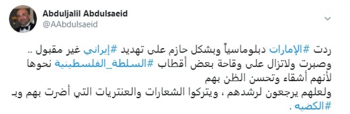 وقال في تغريدة عبر "تويتر" رصدها "المشهد العربي": "ردت الإمارات دبلوماسياً وبشكل حازم على تهديد الإيراني الغير مقبول .. وصبرت ولا تزال على وقاحة بعض أقطاب السلطة الفلسطينية نحوها لأنهم أشقاء وتحسن الظن بهم ولعلهم يرجعون لرشدهم ، ويتركوا الشعارات والعنتريات التي أضرت بهم وبالكضية".