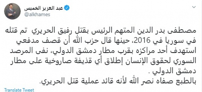 وقال في تغريدة عبر "تويتر" رصدها "المشهد العربي": "مصطفى بدر الدين المتهم الرئيس بقتل رفيق الحريري تم قتله في سوريا في 2016، حينها قال حزب الله أن قصف مدفعي استهدف أحد مراكزه بقرب مطار دمشق الدولي، نفى المرصد السوري لحقوق الإنسان إطلاق أي قذيفة صاروخية على مطار دمشق الدولي".