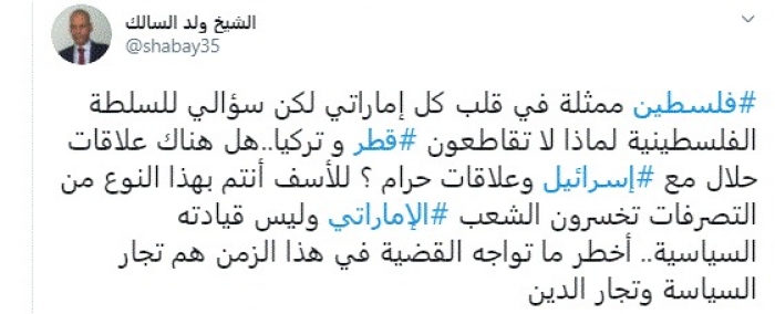 وجه الكاتب الصحفي الموريتاني الشيخ ولد السالك، اليوم، عدة تساؤلات للسلطة الفلسطينية، مؤكدًا في الوقت ذاته أن فلسطين ممثلة في قلب كل إماراتي.