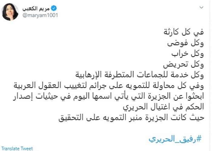 قالت الكاتبة والإعلامية الإماراتية مريم الكعبي، اليوم، إن قناة الجزيرة كانت منبر التمويه في التحقيقات الخاصة بمحاكمة قتلة رئيس الوزراء اللبناني السابق رفيق الحريري.