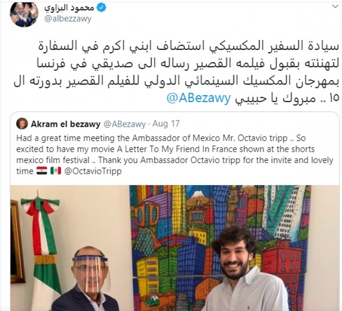 ونشر البزاوي، صورة لنجله أكرم في أثناء تهنئته من سفير المكسيك بالقاهرة، عبر حسابه على تويتر، وعلق: "سيادة السفير المكسيكي استضاف ابني أكرم في السفارة لتهنئته بقبول فيلمه القصير، رسالة إلى صديقي في فرنسا، بمهرجان المكسيك السينمائي الدولي للفيلم القصير بدورته الـ15.. مبروك يا حبيبي".