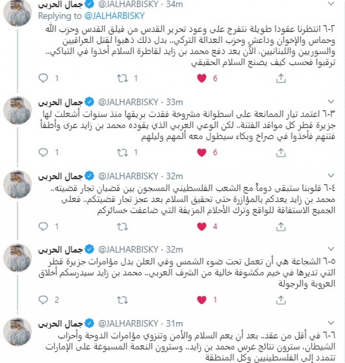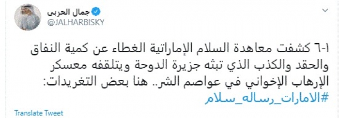 وكتب في سلسلة تغريدات عبر "تويتر" رصدها "المشهد العربي": " كشفت معاهدة السلام الإماراتية الغطاء عن كمية النفاق والحقد والكذب الذي تبثه جزيرة الدوحة ويتلقفه معسكر الإرهاب الإخواني في عواصم الشر.. هنا بعض التغريدات".