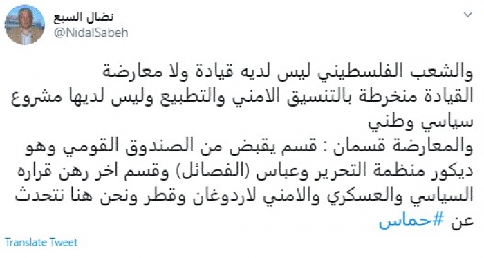 وكتب في تغريدة عبر "تويتر" رصدها "المشهد العربي": "الشعب الفلسطيني ليس لديه قيادة ولا معارضة. القيادة منخرطة بالتنسيق الامني والتطبيع وليس لديها مشروع سياسي وطني".