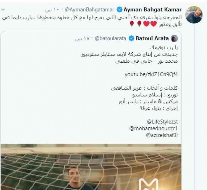 وكتب "قمر" عبر حسابه الرسمي بموقع تويتر: "المخرجة بتول عرفة دي أختي اللي بفرح لها مع كل خطوة بتخطوها، يارب دايما في تألق وتطور".