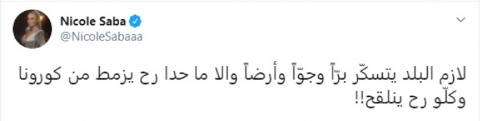 وطالبت نيكول الحكومة اللبنانية بإغلاق البلاد، وكتبت تغريدة، عبر حسابها بموقع "تويتر" قالت فيها: "لازم البلد بتسكر برًا وجوًا وأرضًا، وإلا ما حدا رح يزمط من كورونا، وكلو رح ينلقح".
