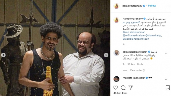 حرص الفنان حمدي الميرغني، على تهنئة أصدقائه بعد نجاح مسلسل "جمجوم وبم بم"، الذي عرض على منصة شاهد.
