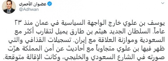 وقال في تغريدة عبر "تويتر" رصدها "المشهد العربي": "يوسف بن علوي خارج الواجهة السياسية في عمان منذ ٢٣ عاماً. السلطان الجديد هيثم بن طارق يميل لتقارب أكثر مع السعودية وموازنة العلاقة مع إيران".