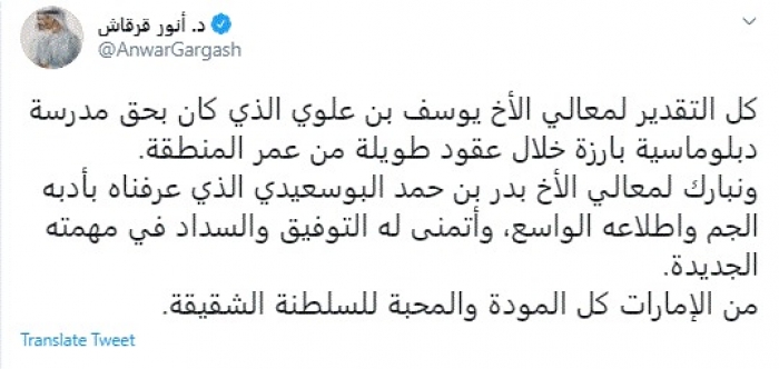 وقال في تغريدة عبر "تويتر" رصدها "المشهد العربي": "كل التقدير لمعالي الأخ يوسف بن علوي الذي كان بحق مدرسة دبلوماسية بارزة خلال عقود طويلة من عمر المنطقة".