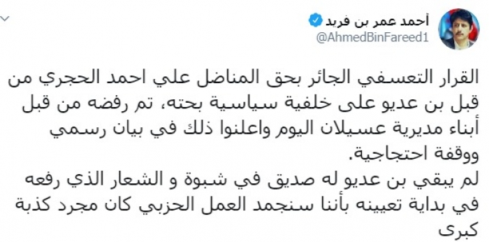 وكتب عبر تغريدة له على "تويتر" رصدها "المشهد العربي": "القرار التعسفي الجائر بحق المناضل علي أحمد الحجري من قبل بن عديو على خلفية سياسية بحتة، تم رفضه من قبل أبناء مديرية عسيلان اليوم وأعلنوا ذلك في بيان رسمي ووقفة احتجاجية، لم يبق بن عديو له صديق في شبوة والشعار الذي رفعه في بداية تعيينه بأننا سنجمد العمل الحزبي كان مجرد كذبة كبرى".
