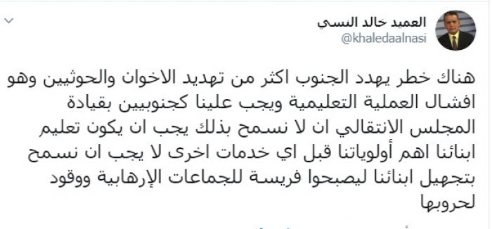 وكتب عبر تغريدة له على "تويتر" رصدها "المشهد العربي": "هناك خطر يهدد الجنوب أكثر من تهديد الإخوان والحوثيين وهو إفشال العملية التعليمية، ويجب علينا كجنوبيين بقيادة المجلس الانتقالي ألا نسمح بذلك يجب أن يكون تعليم أبنائنا أهم أولوياتنا قبل أي خدمات أخرى، لا يجب أن نسمح بتجهيل أبنائنا ليصبحوا فريسة للجماعات الإرهابية ووقودا لحروبها".