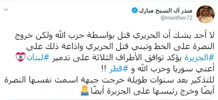 وكتب عبر تغريدة له على "تويتر" رصدها " المشهد العربي": "لا أحد يشك أن الحريري قتل بواسطة حزب الله ولكن خروج النصرة على الخط وتبني قتل الحريري وإذاعة ذلك على الجزيرة يؤكد توافق الأطراف الثلاثة على تدمير لبنان أعني سوريا وحزب الله و قطر، للتذكير بعد سنوات طويلة خرجت جبهة اسمت نفسها النصرة أيضًا وخرج رئيسها على الجزيرة أيضًا ".