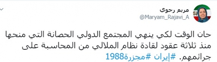 وكتبت عبر تغريدة لها على "تويتر" رصدها " المشهد العربي": "حان الوقت لكي ينهي المجتمع الدولي الحصانة التي منحها منذ ثلاثة عقود لقادة نظام الملالي من المحاسبة على جرائمهم".
