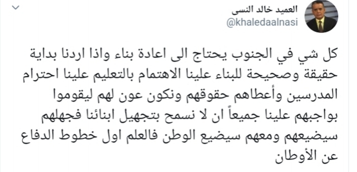 وكتب عبر تغريدة له على "تويتر" رصدها "المشهد العربي": "كل شيء في الجنوب يحتاج إلى إعادة بناء، وإذا أردنا بداية حقيقية وصحيحة للبناء علينا الاهتمام بالتعليم،علينا احترام المدرسين وإعطاءهم حقوقهم ونكون عونا لهم ليقوموا بواجبهم، علينا جميعا ألا نسمح بتجهيل أبنائنا فجهلهم سيضيعهم ومعهم سيضيع الوطن فالعلم أول خطوط الدفاع عن الأوطان".