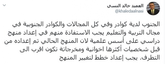 وكتب عبر تغريدة له على "تويتر" رصدها "المشهد العربي": "الجنوب لديه كوادر وفي كل المجالات والكوادر الجنوبية في مجال التربية والتعليم يجب الاستفادة منهم في إعداد منهج دراسي على أسس علمية لأن المنهج الحالي تم إعداده من قبل شخصيات أكثرها إخوانية ومخرجاته تكون أقرب إلى التطرف، يجب إعداد خطط لتغيير المنهج".