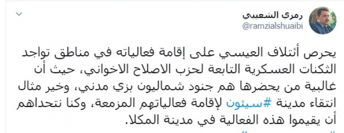 وكتب عبر تغريدة له على "تويتر" رصدها "المشهد العربي": "يحرص ائتلاف العيسي على إقامة فعالياته في مناطق تواجد الثكنات العسكرية التابعة لحزب الإصلاح الإخواني، حيث أن غالبية من يحضرها هم جنود شماليون بزي مدني، وخير مثال انتقاء مدينة سيئون لإقامة فعالياتهم المزمعة، وكنا نتحداهم أن يقيموا هذه الفعالية في مدينة المكلا".