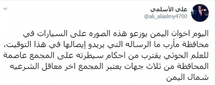 وكتب عبر تغريدة له على "تويتر" رصدها "المشهد العربي": "اليوم إخوان اليمن يوزعون هذه الصورة على السيارات في محافظة مأرب، ما الرسالة التي يريدون إيصالها في هذا التوقيت، للعلم الحوثي يقترب من إحكام سيطرته على المجمع عاصمة المحافظة من ثلاث جهات يعتبر المجمع آخر معاقل الشرعية شمال اليمن".